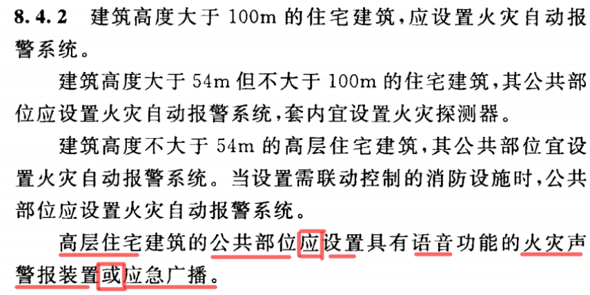 我们先来看“建规”(GB 50016-2014《建筑设计防火规范》(2018年版))中对于高层住宅建筑设置消防设备的规定。其中8.4.2要求“公共部分应设置具有语音功能的火灾声警报装置或应急广播”,因此有的高层住宅项目的火灾报警系统设计图纸上设计采用“语音型声光”,有两种比较特殊的方式:只有语音型声光,没有消防应急广播;语音型声光+消防应急广播。