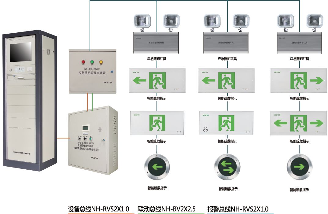 综合管廊中采用的消防应急照明及疏散指示系统为集中电源集中控制型消防应急照明及疏散指示系统。本系统将以往疏散指示系统为固定疏散方向的工作方式,提升为根据火灾现场情况合理引导人们远离危险区域的智能疏散指示系统。