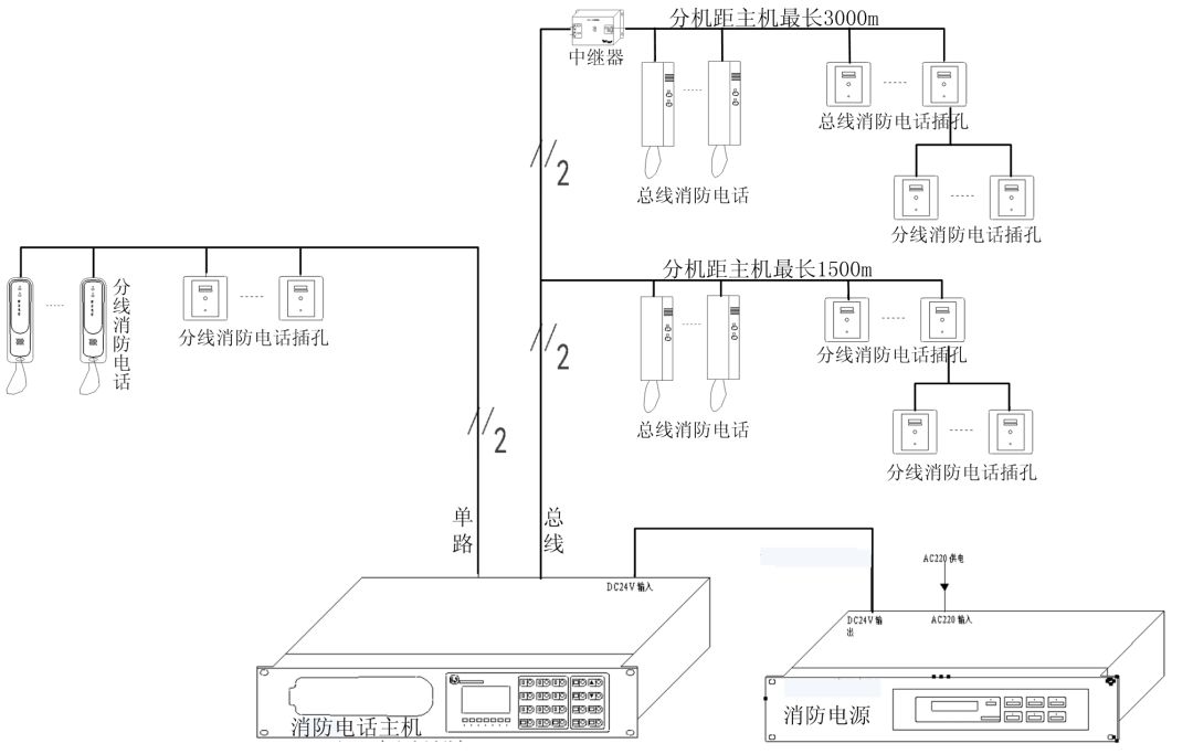 远距离消防电话系统为总线消防电话系统,由消防电话总机、总线消防电话分机、总线消防电话插孔、手提消防电话分机、外供DC24V消防直流电源及24V备用电池构成。通讯距离可达到4500M。