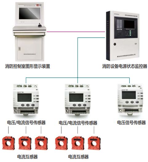 消防设备电源监控系统由消防设备电源状态监控器、电压信号传感器、电压电流信号传感器、电流互感器组成。发现相关故障及时处理,从而有效避免火灾发生时消防设备由于电源故障而无法运行的情况,以保证消防设备可靠地运行。