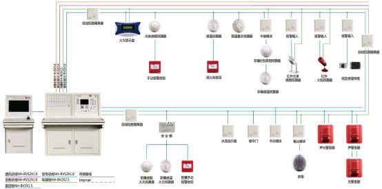 包含:1.“海湾云”智慧消防平台、2.火灾自动报警及消防联动控制系统、3.可燃气体探测报警系统、4.电气火灾监控系统、5.线型光纤感温火灾探测系统、6.消防应急照明及疏散指示系统、7.防火门监控系统、8.消防设备电源监控系统。各分系统均有独立控制器,均通过光纤进行环形联网,各个系统集中机设置在监控中心,连接到火灾自动报警系统集中机,信息均可在图形显示装置上显示。多个监控中心的火灾自动报警系统集中机将信息上传至总监控中心。