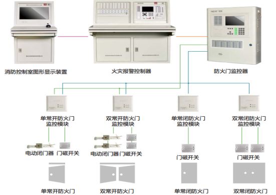 防火门监控系统由防火门监控器、防火门监控模块、防火门门磁开关、防火门电磁释放器、防火门电动闭门器等部件组成。防火门的开闭在人员疏散中起到至关重要的作用。疏散通道途经的防火门状态信息必须反馈至消防控制室或有人值班场所内的防火门监控器。