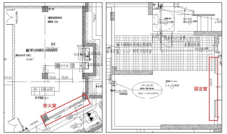 案例2:某项目建筑面积大于50m²,设置防火窗(左)、固定窗(右)且经常有人员停留的房间未设置排烟设施,不满足规范要求。如下图所示。
