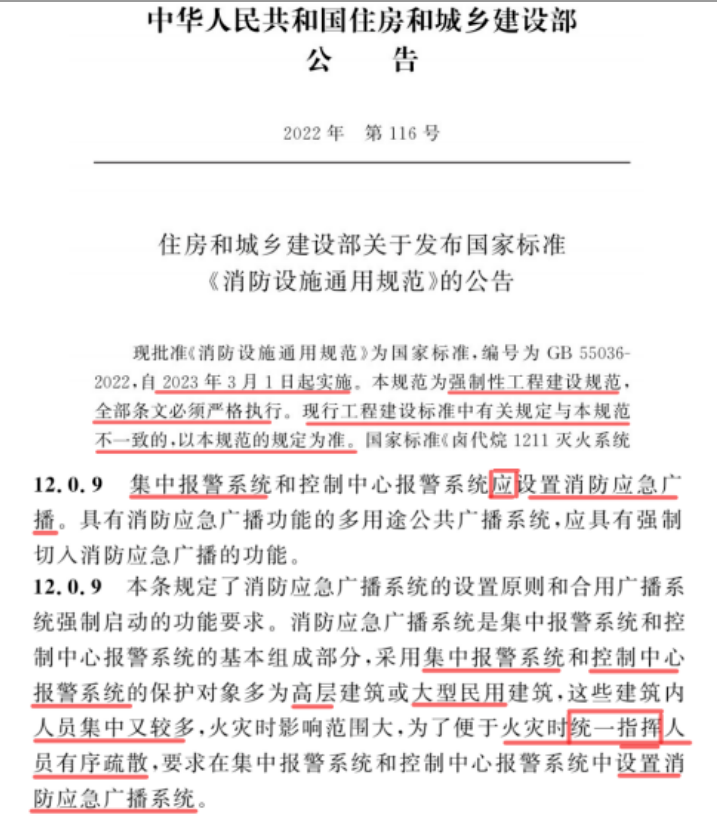 因此:按照GB 55036通规、GB 50116火规必须设置消防应急广播的建筑(含高层住宅建筑),是不能也不允许采用语音型声光来替代消防应急广播。