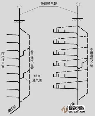 3)专用通气立管每隔2层,主通气立管每隔8-10层设置结合通气管与污水立管连接;