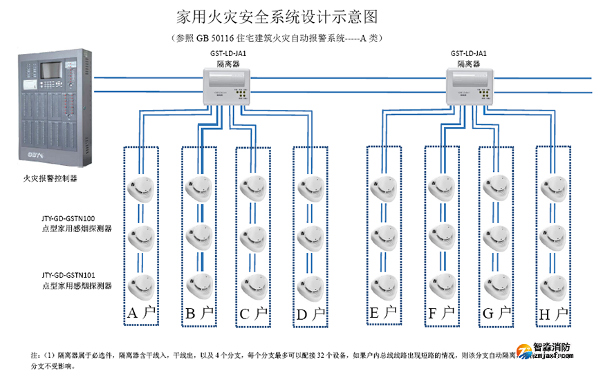 GST家用火灾安全系统B类设计中,隔离器为可选件,不占地址,家用火灾报警控制器和专用电源箱、家用探测器均占地址点。