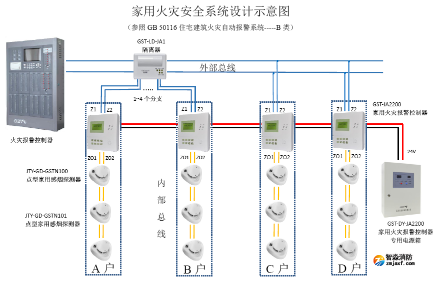GB50016-2014《建筑设计防火规范》自2015年5月1日起实施,明确>54M住宅宜套内安装探测报警,>100MM住宅应安装探测报警。GST家用火灾安全系统为满足该标准对住宅消防报警要求而设计。GST家用火灾安全系统中家用火灾报警控制器由GST-DY-JA2200家用火灾报警控制器专用电源箱提供DC24V电源,采用用内部总线与家用火灾探测器通讯,接收探测器上传的火警和故障信息。能够预存两组用户电话号码,当家用火灾报警控制器收到探测器上传的火警信息后,立即发出声光报警信号并显示相应火警信息,同时自动拨打预存号码,并发出语音或短信报警。配接了火灾报警控制器,还能够通过外部总总线及时上传火警或故障报警信息。